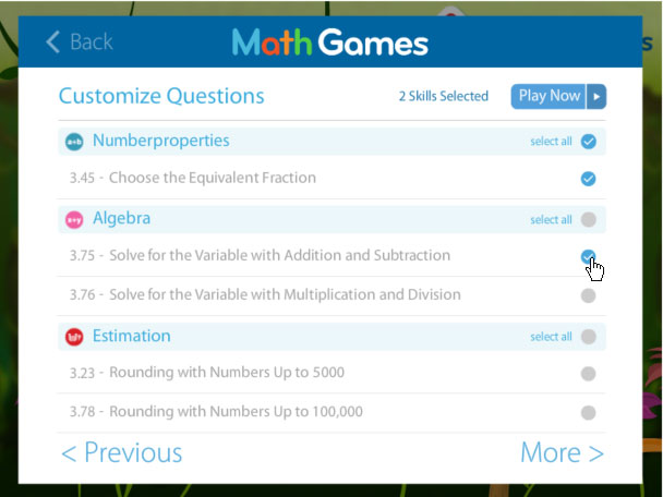 Customize your gameplay and learning by selecting the skills you want.