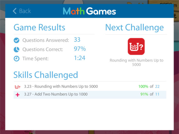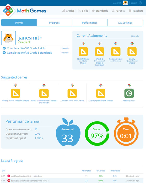 Here you can see your account. You can track your progress and performance. See which skills are recommended and change your account settings. Note that the results of the most recent game that you played has been recorded.